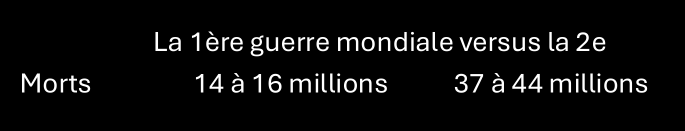 Il y aura des nombreuses pertes militaires, mais aussi civiles. Ceci cause des pertes importantes par rapport à la population totale. Les civils représentent 2/3 des pertes totales à cause des bombardements (nouvelles formes d’armement) et le génocide.
