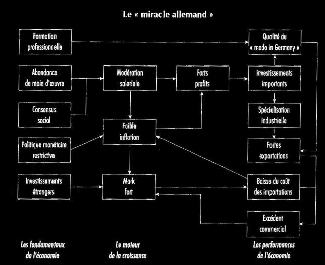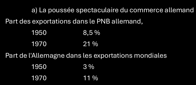 4. Libre-échange et intégration européenne : L’ouverture au commerce mondial et la participation active à la construction européenne (CECA, CEE) renforcent l’économie allemande. Le protectionnisme est abandoné et la RFA adhère à l’esprit de Bretton Woods.