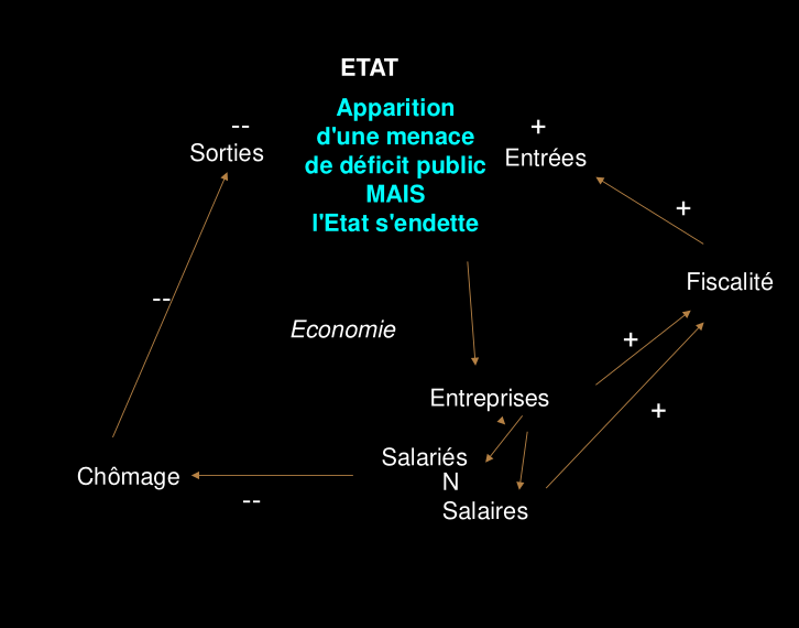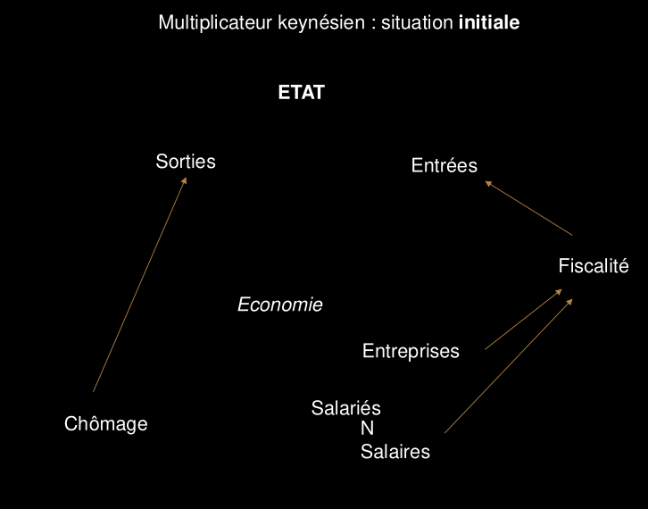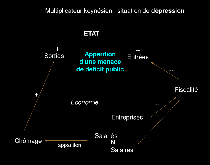 On commence avec un état qui a des recettes et des sorties. Mais tout d’un coup on a une menace comme une dépression économique. Il y a moins de recettes mais plus de sorties. On doit payer le chômage, etc. La depression se multiplique chaque fois plus (Ex:1929 et son effet dans les suds) chaque fois on consomme moins et on produit moins. Plus de chômage et plus de dépenses et moins de recettes. Avant en s’en foutait, on pensait que le chômage était frictionnaire et temporel à cause du changement de travail. Mais pour Keynes c’est un problème de dynamisme.