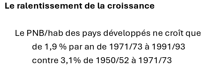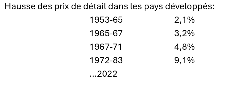 - L’OPEP (les pays du pétrole qui étaient maintenant indépendants) augmente les prix pour les occidentaux pour équilibrer le rapport de forces (influencer la géopolitique contre israel, guerre de Jom Kippur, etc).→ inflation en occident.