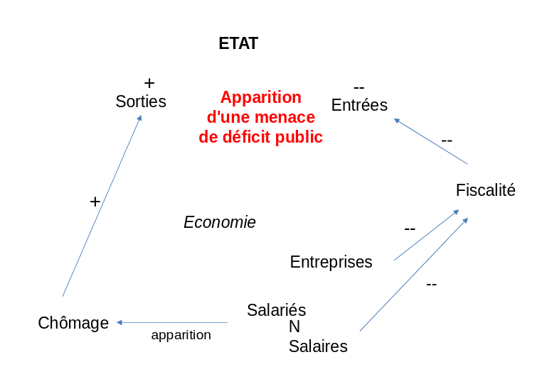 Les paramètres économiques et les politiques des gouvernements causent une hausse des dépenses publiques. Dans les années 90 cet état est très utile, mais il y a une répercussion sur les comptes publiques et les caisses de prestations sociales. Elles sont en crise. Le modèle keynésien d’intervention ne sert à rien dans ce moment de crise.