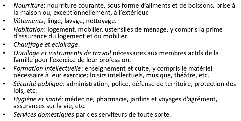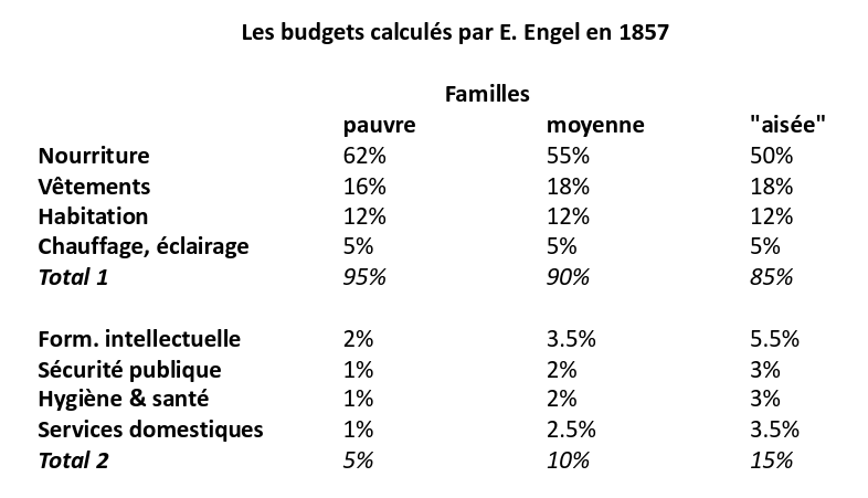 Il analyse les salaires des ouvriers et constate la relation inverse entre le revenu d’un ménage et ce qu’il va dépenser. Plus une famille est pauvre et plus elle doit consacrer son argent à son entretien physique, même si les familles riches consomment des biens plus chers et élaborés.