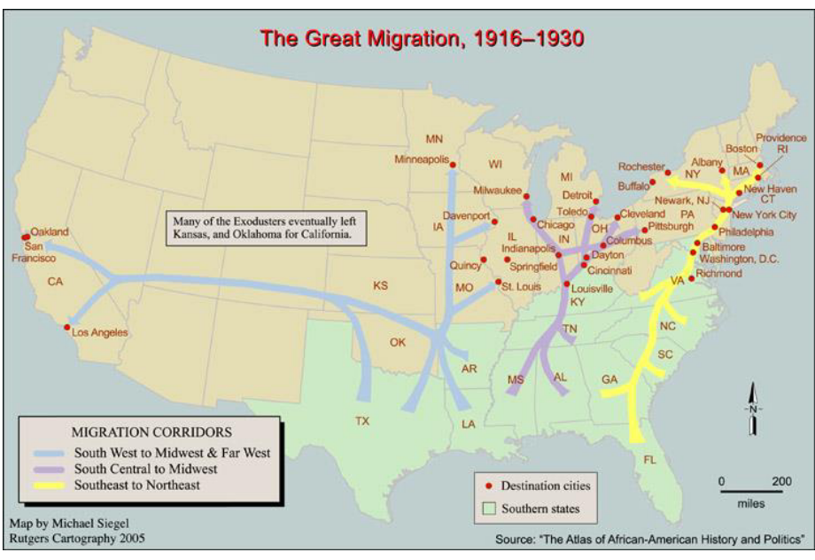 La carte montre la Grande Migration (1916-1930), où des nombreux Afro-Américains ont quitté le Sud des États-Unis pour s’installer dans les villes industrielles du Nord et de l’Ouest, fuyant la ségrégation et cherchant de meilleures opportunités économiques. Les principales destinations incluent Chicago, New York, et Los Angeles.