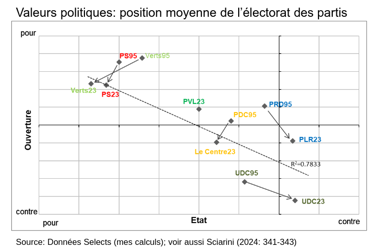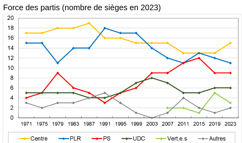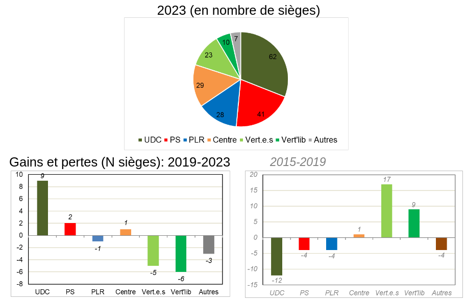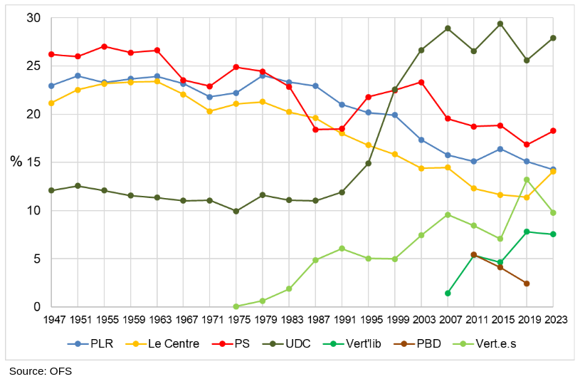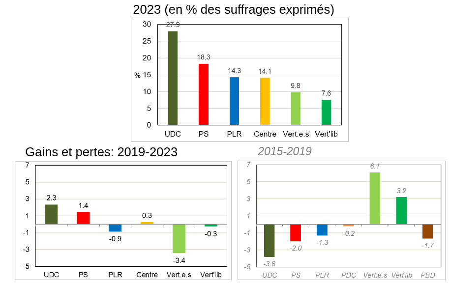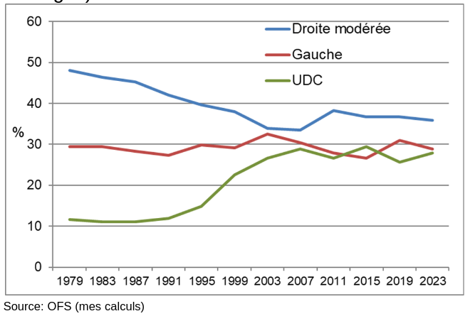 • Montée en puissance de l’UDC, vague verte en 2019, reflux en 2023.