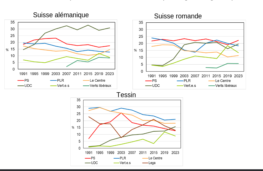 Après la WW2, la Suisse est réputée par sa stabilité, mais à partir des années 1990 les choses changent. Avant de faire sa montée en popularité l’UDC c’était juste un parti junior. Le parti vert a aussi connu un score historique en 2015. L’évolution entre 2019 et 2023 est le miroir de celle de 2015 à 2019. Les partis reculent et avancent après. Le mode de scrutin est proportionnel. Aucun parti n’a franchi le seuil de 30% pendant des siècles, cependant l’UDC est aujourd’hui proche. Genève et le Tessin (avec sa Lega) ont deux partis de droite. Dans les autres cantons c’est juste l’UDC. On a un système triparti, avec plus ou moins la même force politique pour chaque camp.