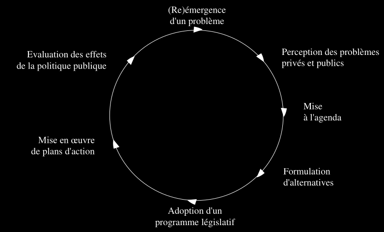 Mais aussi au cycle proposé par Jones: La phase de formulation commence dans l’émergence et finit avec l’adoption d’un PL. Après, la politique est mise en oeuvre et évaluée pour voir si le problème est résolu ou s’il a réémergé.