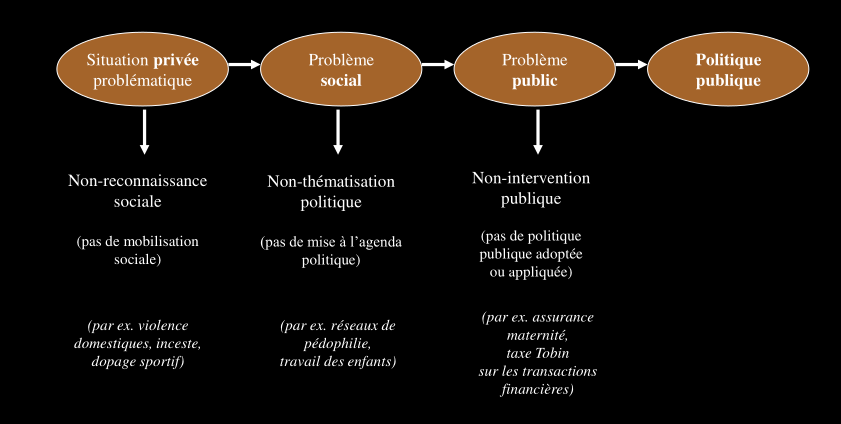 La majorité de problèmes ne franchissent pas la barrière vers le problème social. Des fois ça reste comme problème publique pendant des décennies par manque de consensus comme l’assurance de maternité.