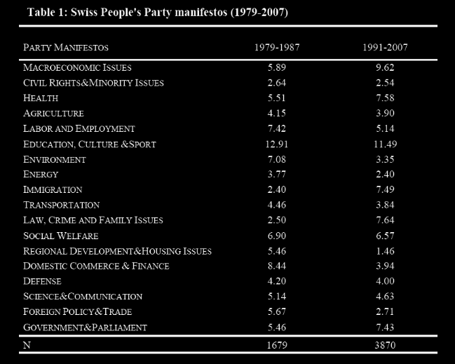 L’UDC a eue une croissance spectaculaire, surtout en 1992. A quoi ce doivent ces gains électoraux? À la mise en avant de certains sujets politique? Le tableau montre le changement des thèmes traités dans le manifestes électoraux de l’UDC. Petit à petit l’importance relative accordée aux enjeux politiques change. Comme on a vu dans Séance 16-Comportement politique l’offre politique et le vote d’enjeu influencent le comportement des électeurs. L’UDC accorde de l’importance surtout à l’immigration. Il y a une différence entre l’ancienne UDC (parti agricole) et le grand parti de droite actuel. L’agriculture est toujours un thème traité, l’UDC reste agrarien à la base (il a un fort appuie dans l’ancienne classe moyenne agriculteur).
