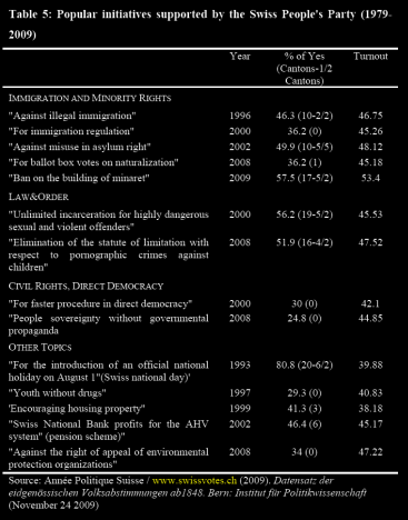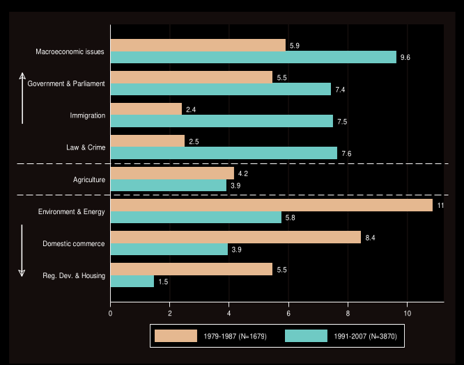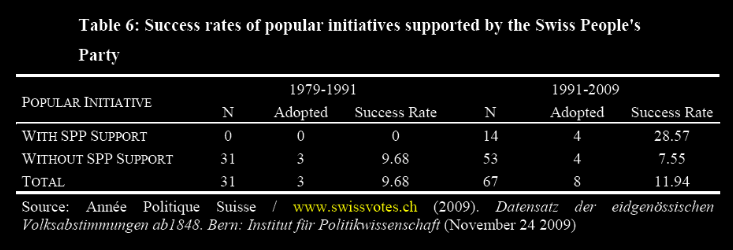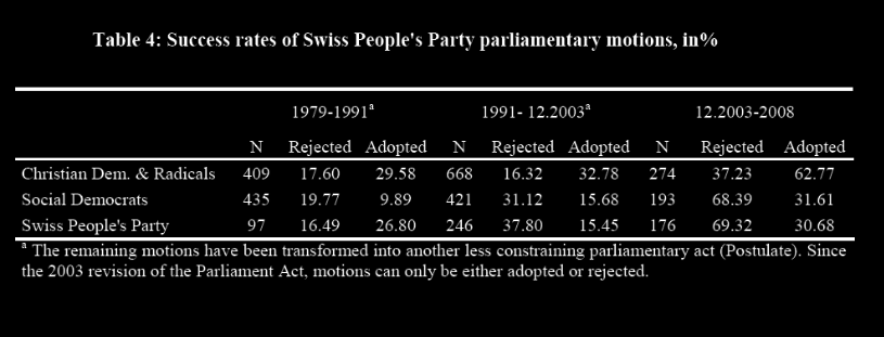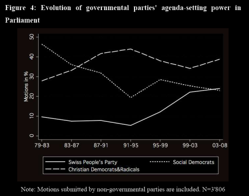 La mise à l’agenda de ces problèmes va avoir plusieurs effets mais on doit aussi passer a l’action c’est pas seulement une question d’agenda: Les motions de l’UDC augmentent considérablement. Ceci reflète en quelque mesure les enjeux favorisés dans l’agenda comme la migration. Quand une motion est adoptée par le parlement (2 chambres) elle passe généralement a être adoptée par le gouvernement donc elle rentre aussi dans son agenda (parlement et gouvernement). Avant l’UDC avait la même influence sur l’agenda du parlement que les autres parties (comme PS), mais après avoir changer ce taux chute. Même chose pour le PS, mais pour le centre le taux d’acceptation augmente. La transformation d’UDC a été donc problématique puisqu’ils ont plus de voix et ils suivent leur promesses mais ils n’ont pas d’appuis. L’offre politique est ineffective, juste du bruit. Mais l’UDC peut aussi utiliser les initiatives populaires, comme ça on change l’agenda avec des effets sur la constitution et etc. Une fois quelles sont acceptées par la population et les cantons l’UDC arrive à son but son devoir rien à personne. Il est le seul vainqueur. En plus ils contrôlent tout, depuis la formulation à l’application. Ceci est un avantage, ça permet à l’UDC d’avoir du succès. Avant l’UDC ne passait pas par la démocratie directe. Jamais. Cependant maintenant son succès est de 28%, pendant que le succès moyen pour les autres partis est 8-9%. Ceci est impressionnant.