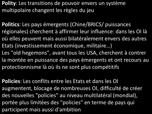 - Passage d’un ordre inter-étatique anarchique (ordre Westphalien) à un système de gouvernance globale.