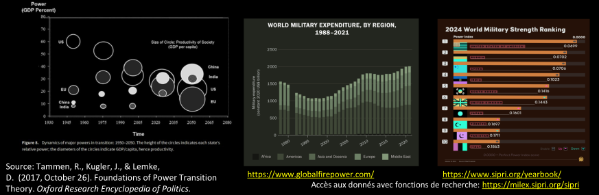 En RI, on étudie le pouvoir matériel (p.e. PIB/GDP, armements, population, territoire) et immatériel (p.e. institutionnel, idéel, structurel). Le pouvoir se manifeste dans la capacité de coercition, d’incitation et de persuasion.