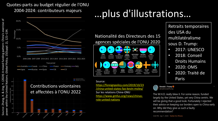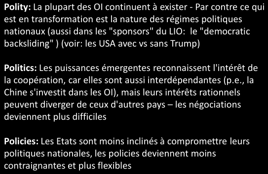 - Réalisme: les OI dépendent du soutien des grandes puissances, le déclin de l’hégémonie américaine et le passage à un ordre multipolaire entraîne le retrait du support pour le LIO.