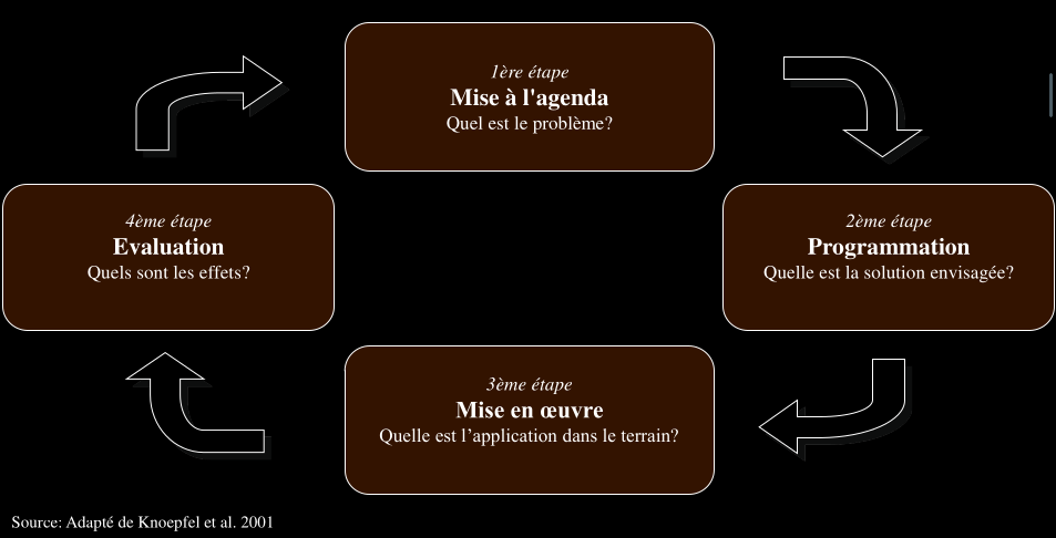 La phase de formulation commence dans l’émergence et finit avec l’adoption d’un PL. Après, la politique est mise en oeuvre et évaluée pour voir si le problème est résolu ou s’il a réémergé.