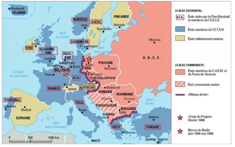 • L’Allemagne, carrefour de toutes les tensions. Deux zones d’occupation. Le blocus de Berlin par l’URSS, coupant les accès terrestres à Berlin-Ouest pour forcer les Alliés à abandonner la ville. Réponse des Alliés avec le pont aérien de Berlin, approvisionnant la ville par voie aérienne. L’Allemagne est coupé dans une zone est et ouest mais aussi sa capitale: Berlin. C’est le symbole de la division d’Europe et du monde.