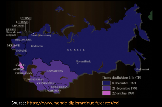 - Décembre 1991: fin de l’URSS: les républiques soviétiques se déclarent indépendantes (Estonie, Lettonie, Lituanie, Kazakhstan, Ukraine, Biélorussie, Tchétchénie, Arménie, Géorgie, Ouzbékistan, etc.). Création de la Communauté des États indépendants (CEI qui existe toujours mais ne sert à rien).
