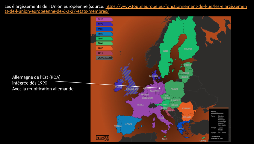 - 1990: intégration de l’ex RDA via la réunification de l’Allemagne.