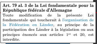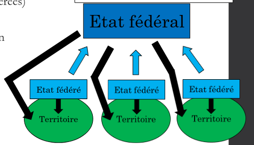 Un autre principe de ce système est celui de superposition. Les entités fédérées sont souveraines mais elles doivent renoncer a une partie de leur souveraineté pour que l’État fédéral puisse exister. Lorsqu’il prend une décision, elle s’impose aux entités fédérées. Mais il y a aussi une certaine participation (principe de participation), les fédérées peuvent influencer l’état fédéral. Dans le parlement fédéral on trouve souvent une chambre composée par des représentants des entités fédérées. Exemple: Allemagne Dans le cas de l’Allemagne celle ci c’est unifié tardivement confédération courte fédération allemande. Comme on peut observer, l’Allemagne ne peut pas être réorganisée. Il doit rester une fédération, pour éviter les événements pre-WW2 une autre fois.