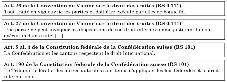 Il y a pas de police pour faire respecter ces traités alors ne pas les respecter les met dans un état de lettre morte. Mais il y a des mécanismes comme les sanctions économiques, embargos, etc. Celles ci peuvent s’appliquer dans quelques cas, mais fondamentalement le droit international ne peut pas exister si les États ne les respectent et reconnaissent pas. Un État (en Suisse un canton par exemple) ne va jamais pouvoir refuser de ne pas respecter un traité parce qu’il va en contre de son droit interne. Sinon ça serait facile de les contourner, il suffit d’émettre une loi contraire au traité. Comme créer une loi pour utiliser la torture dans Genève, on peut la faire mais elle ne peut pas être légitime puisqu’on doit respecter le droit international.
