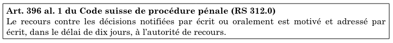 Ces lois régissent a qui s’adresser et comment le faire pour mettre en oeuvre le droit pour être sûr que les tribunaux vont s’emparer d’un certain cas et le traiter correctement. Dans cet article, on énonce que pour contester un decision judiciaire on doit rédiger cela pour écrit dans un délai de 10 jours et on sera pris en compte (seulement si on conforme a cette loi de procédure bien sûr).