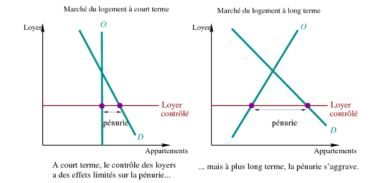 - La réglementation peut concerner les augmentations possibles plus que le loyer lui-même, mais l’effet sera semblable (le loyer sera en-dessous de sa valeur d’équilibre).