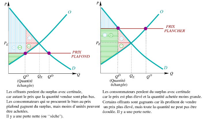 Graphiquement, sur un marché, c’est l’inverse qui est vrai, car le plafond est un maximum qui empêche le prix d’aller plus haut et doit donc être plus bas que le prix d’équilibre. C’est l’inverse pour le prix plancher.