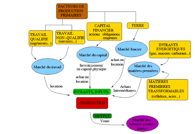 Une entreprise transforme des intrants (inputs) en extrants (outputs) via une fonction de production. =⇒ q = f (K, L, T, E, M ) Les facteurs de production: K = capital physique (machines, bâtiments… ); L = travail; E = intrants énergétiques, T = terre, M = matières premières.