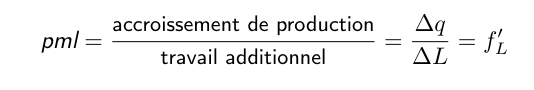 - La productivité marginale = “de combien d’unités du bien s’accroît la production avec un travailleur supplémentaire”: