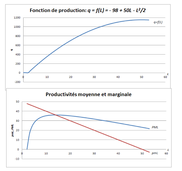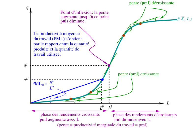 Hypothèse: À court terme, cette relation technique obéit à la loi des rendements décroissants = productivité marginale du travail décroît avec la quantité de travail.