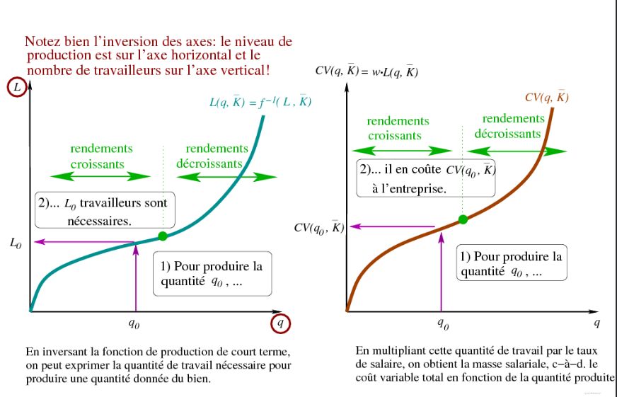 - Lecture: Avec une capacité de court terme donnée par K, L travailleurs sont requis pour produire la quantité q.