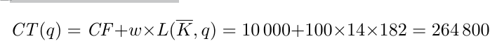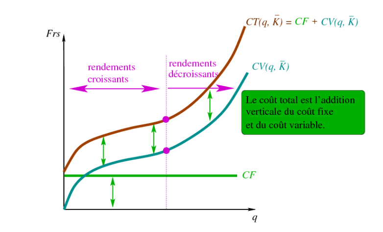 - Le coût total peut donc s’exprimer comme: CT (q) = CF + CV (q)