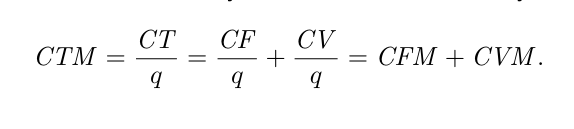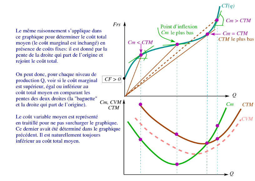 - Le coût total moyen est le coût total par unité produite, soit l’addition du coût fixe moyen et du coût variable moyen: