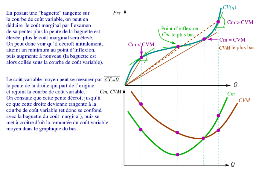 Par définition, le CF ne varie pas lorsque la quantité est modifiée, donc le Cm nous indique nécessairement la variation du CV. L’hypothèse des rendements décroissants se vérifie lorsque le coût marginal est croissant.