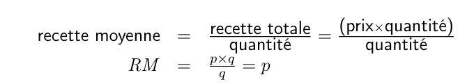 - La recette moyenne (RM) indique combien l’entreprise perçoit par unité vendue. Elle s’obtient en divisant la recette totale par la quantité, et est donc égale au prix (p):
