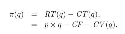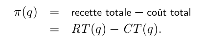 - Le profit (π) est la différence entre la recette totale (RT ) et le coût total (CT ), qui dépendent de la quantité produite et vendue, q: