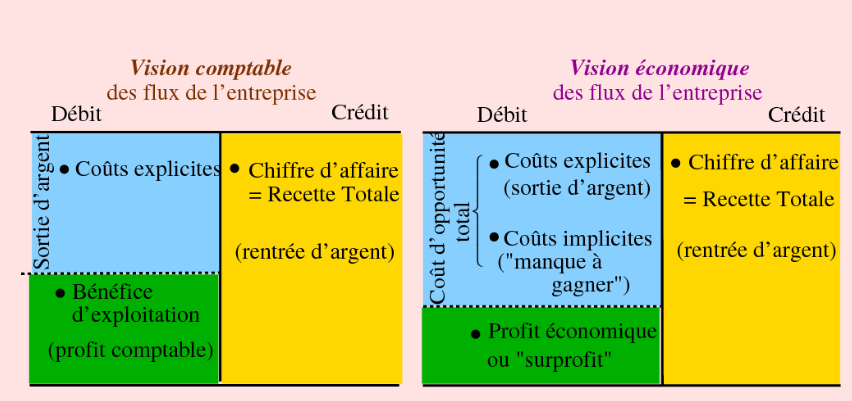 Le coût d’opportunité d’une entreprise est la somme des coûts explicites et des coûts implicites. Le comptable ne s’intéresse généralement qu’aux flux financiers entrant et sortant de l’entreprise (coûts historiques). Les coûts comptables ne comprennent que les coûts explicites.