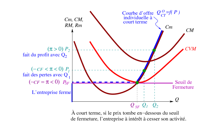 Si le prix est tel que, lorsque l’entreprise maximise le profit (p = Cm(q∗)), la recette totale ne couvre pas les coûts variables, alors elle a intérêt à cesser la production: Elle a passé le seuil de fermeture.