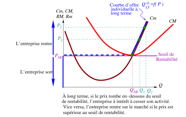 - À long terme, l’entreprise quitte le marché si la recette totale est inférieure à son coût total, ce qui revient à définir son seuil de rentabilité:
