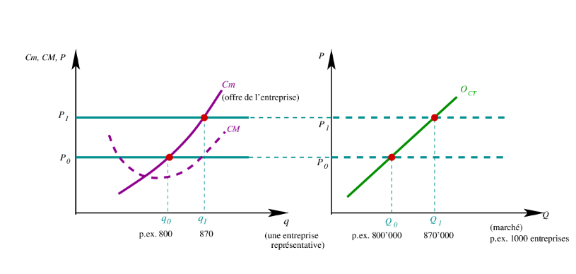 - Chaque entreprise ajuste sa quantité offerte le long de son coût marginal de sorte que la variation de la quantité totale offerte sur le marché correspond à un ajustement sur la marge intensive (chaque enteprise présente sur le marché accroît son niveau de production).