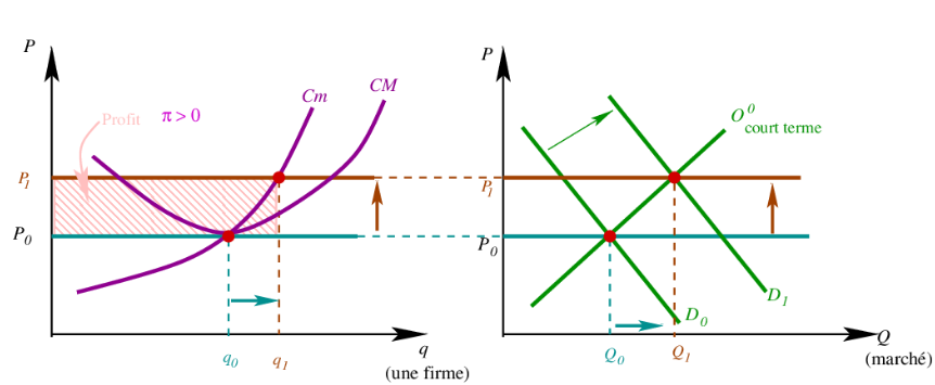- Ce profit (économique) attire des nouveaux entrants dans le marché, ce qui cause un déplacement de l’offre de court terme vers la droite (marge extensive).