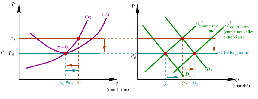 - Cet accroissement de l’offre pousse le prix à la baisse (et la quantité échangée augmente) jusqu’à ce que l’ancien prix d’équilibre soit atteint à nouveau, où les profits disparaissent (et l’entrée sur le marché cesse).