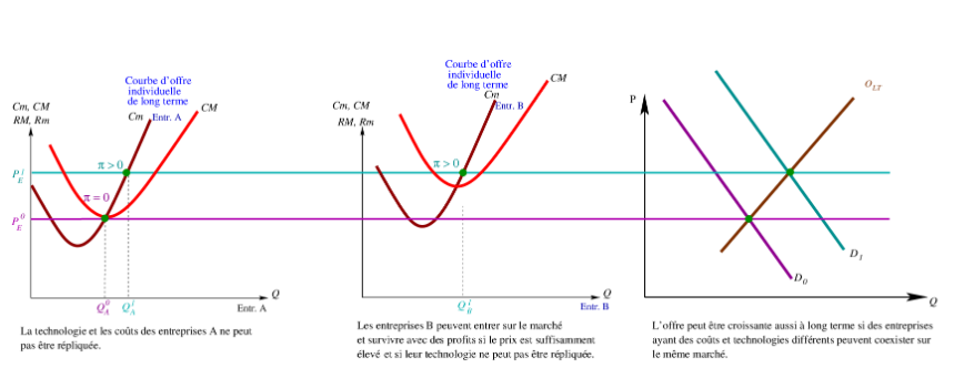 - La sortie est une décision de long terme de quitter le marché (tous les coûts sont variables). Une condition analogue préside à l’entrée sur un marché: un profit positif est possible.