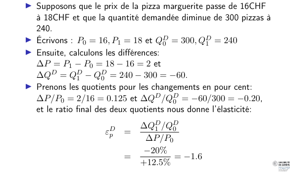 Donc quand le prix est élevé une diminution de prix comme 1 CHF donnée sera relativement faible. Mais la quantité demandée augmente proportionnellement beaucoup. Tout ceci en proportion à lorsque le prix est bas. Et vicerversa.