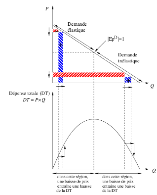 On voit donc le lien avec l’élasticité-prix de la demande: lorsque le prix est élevé, la demande est élastique et la quantité réagit proportionnellement plus que le prix. D’où l’impact haussier sur la dépense totale, alors que l’inverse est vrai si la demande est inélastique. On peut maintenant savoir quand la DT/RT diminue ou augmente: