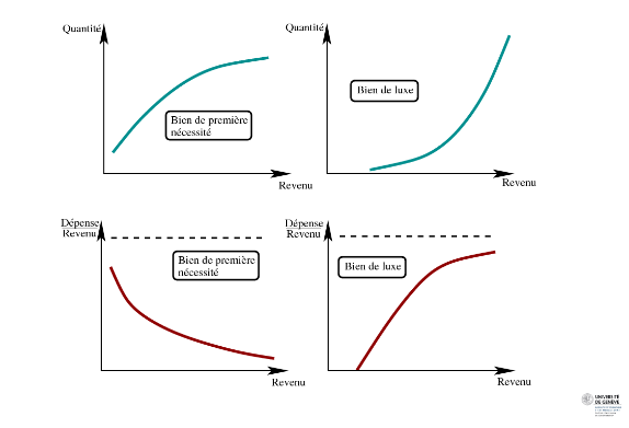 On peut aussi observer l’élasticité et identifier les biens essentiels (élasticité-revenu entre 0 et 1) et les biens de luxe (élasticité entre 1 et 2). Parce qu’évidemment, ils ont une relation avec le revenu: