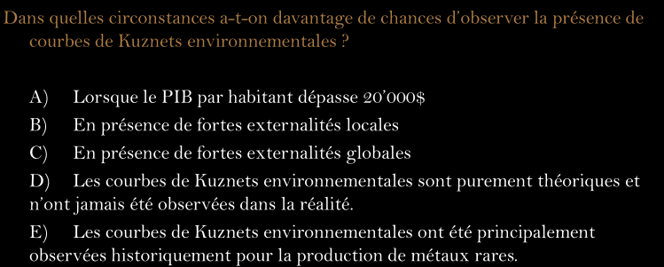 - En revanche, polluants avec externalités globales, très dispersées (cas des émissions de CO2 – free rider problème) présentent des points de retournements très élevés voire inexistants (ou pas encore atteints!).