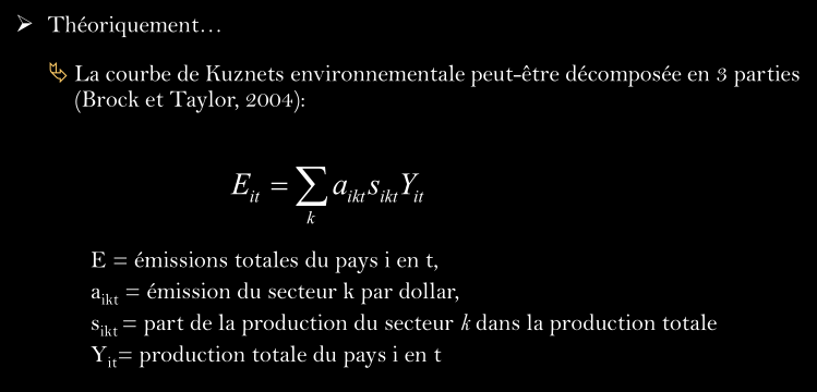 - Depuis de nombreuses études empiriques utilisant une grande variété : (i) de polluants (émissions automobiles, déforestation, émissions de gaz à effet de serre, déchets toxiques, indoor air pollution, etc.); (ii) de techniques économétriques (panel avec effets fixes et aléatoires, fonction polynomiale, techniques non-paramétriques); (iii) de pays, période, variables de contrôle (ouverture au commerce, corruption, institutions, etc.).