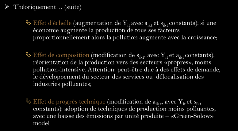 - Attention dans l’interprétation: la croissance économique ne mène pas automatiquement à une amélioration environnementale, pas de prise en compte de facteurs corrélés avec à la fois des niveaux de revenu et de pollution (ex: régulations environnementales).