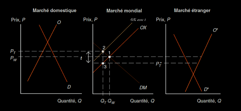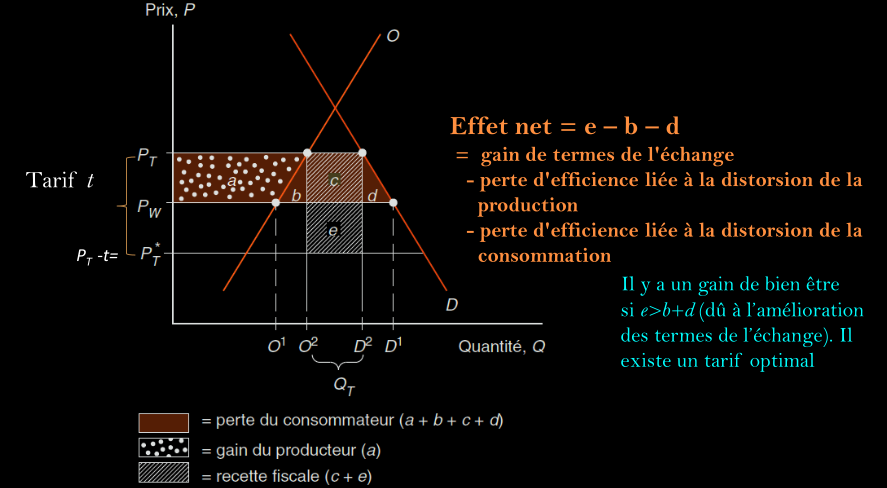 - Analyse de l’impact sur le bien-être suite à l’introduction d’un tarif t par un grand pays (qui peut influencer les prix internationaux).