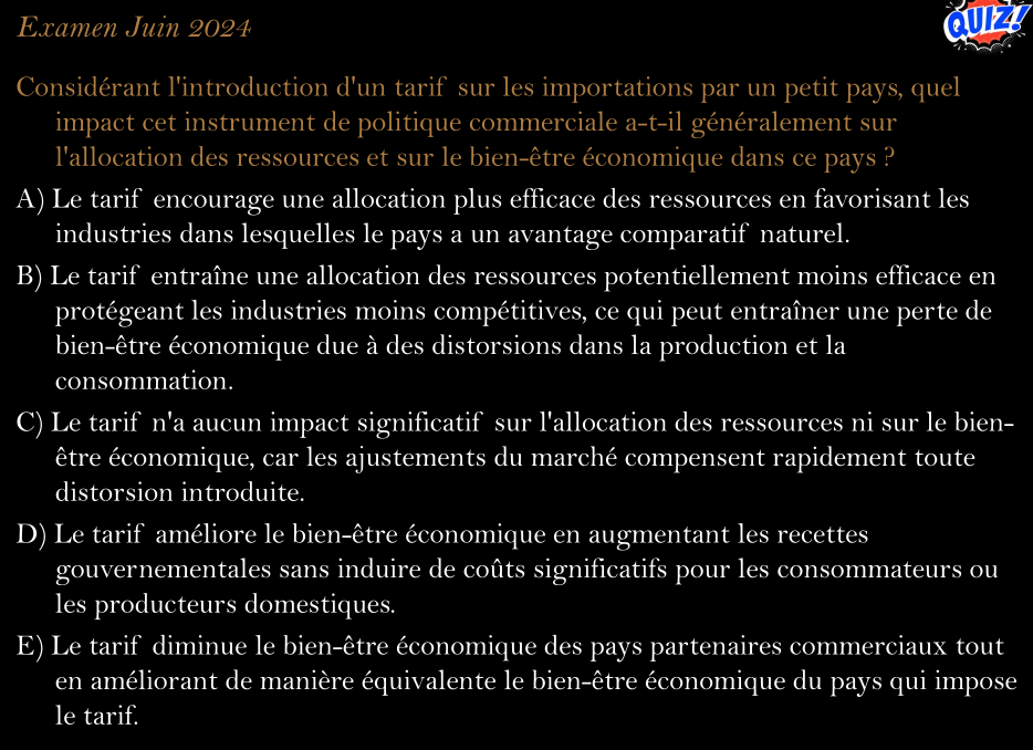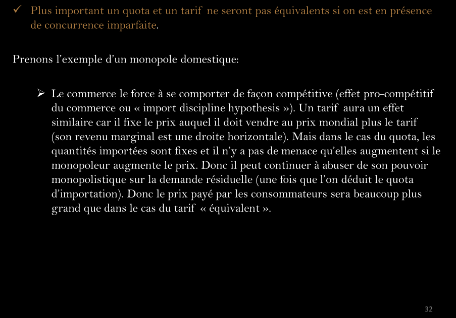 - Idée : comme US est un grand pays, possible que le pays en sorte gagnant car les producteurs étrangers baissent leurs prix et absorbe une grande partie du droit de douane.