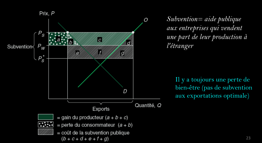 - Il est important de remarquer qu’il faut de la protection à l’importation cumulée avec la subvention aux exportations sinon les consommateurs peuvent toujours importer au prix mondial à la place d’acheter des producteurs nationaux au prix plus élevé. Dans ce cas la subvention aux exportations devient une subvention à la production (bcp plus coûteuse pour les caisses de l’Etat). Le consommateur importerait au prix mondial toute sa consommation et le producteur exporterait toute sa production au prix mondial plus la subvention.